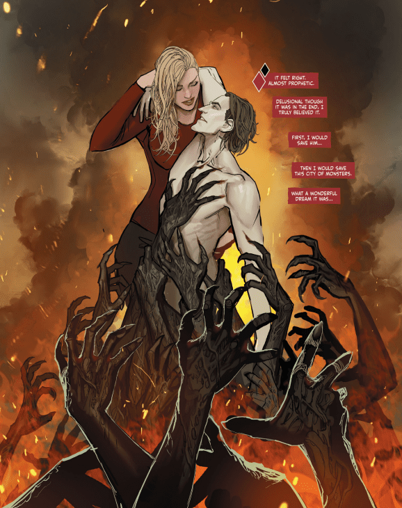 «Su relación se basa en el dominio y la sumisión de carácter insano, soportar el dolor por la esperanza del amor… Aunque en las novelas, el monstruo termina domado… aquí.. él la devora. » – Extracto de Harleen (Sejic, S.)